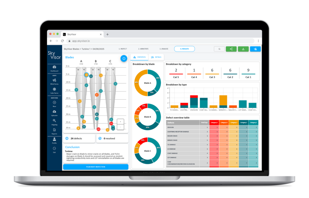 The SkyVisor Wind Results page has been updated for a cleaner, faster, and more intuitive experience. This upgrade applies to both blade and tower inspections and is fully optimized for smartphones and tablets, allowing you to review results anywhere.